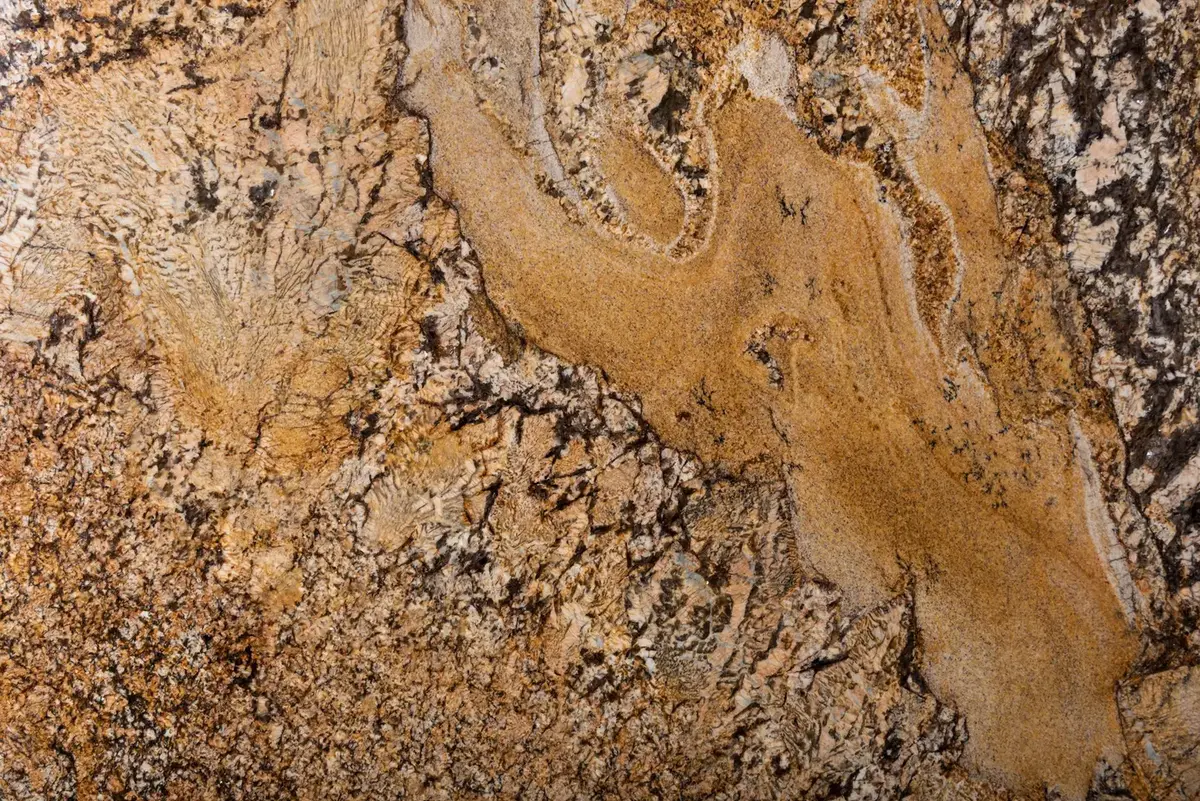 Exklusiv granit med mörk bakgrundsfärg och svepande mönster i guldiga och vita toner.